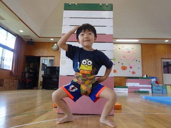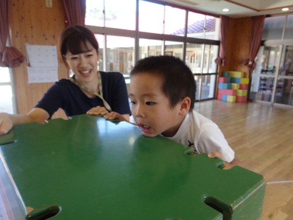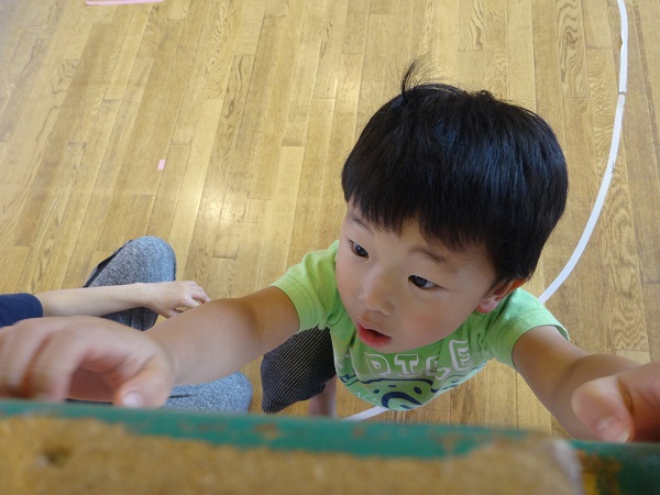 いつもにこにこ笑顔のばす組さん、巧技台登りになると真剣な表情に早変わり。