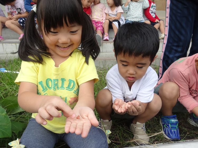 「わぁ~✨あかい種だね」と興味津々に種を見つめる子どもたち。