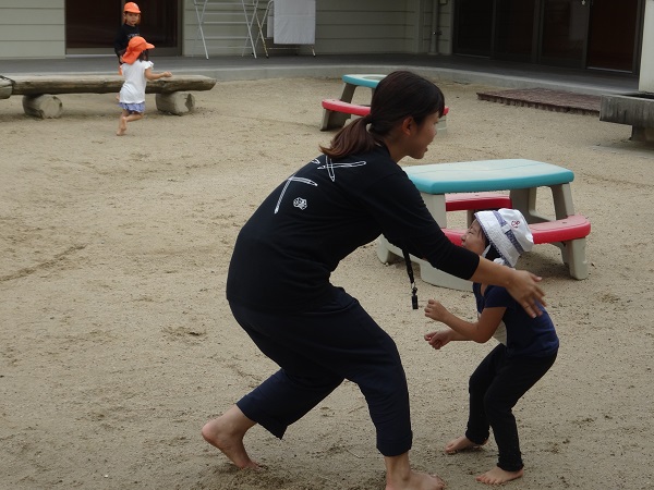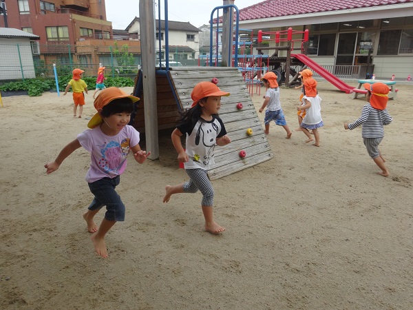 練習の後は、園庭に出て”レンジでチンおにごっこ”をしました。
