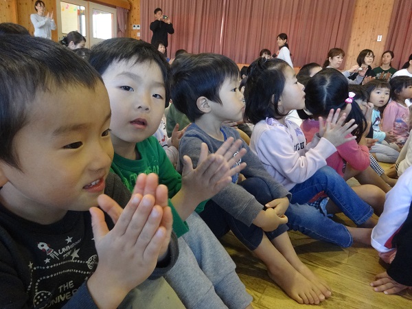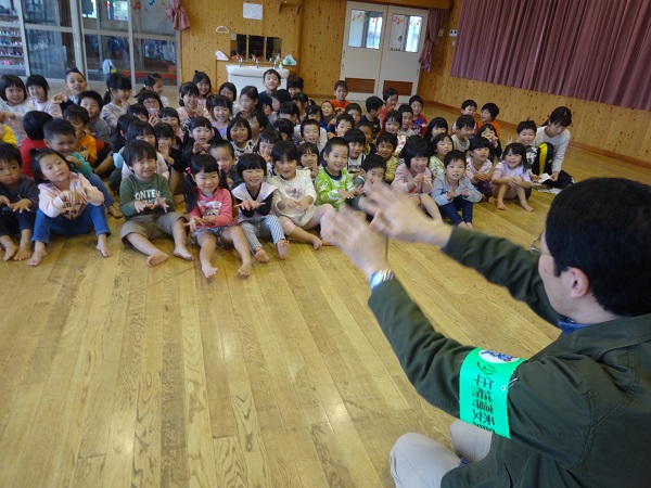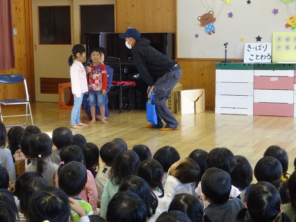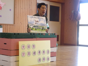 集会の後は、大田市少年補導委委員の松浦さんが、手遊びと絵本を読んでくださいました。