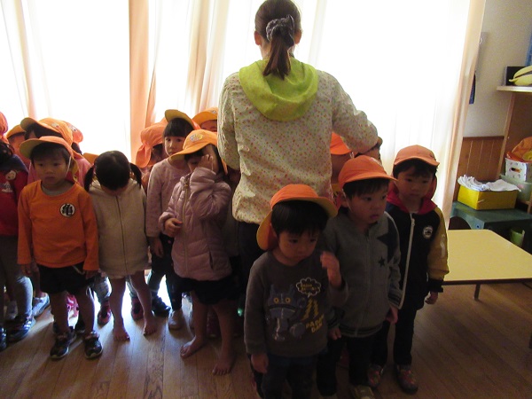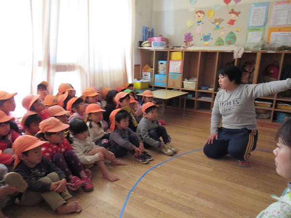 「怖い人が来たんだよ。」「見つからないように静かに避難で来たね。」と、みんなで振り返って、もしもの時の避難の仕方を確認しました。