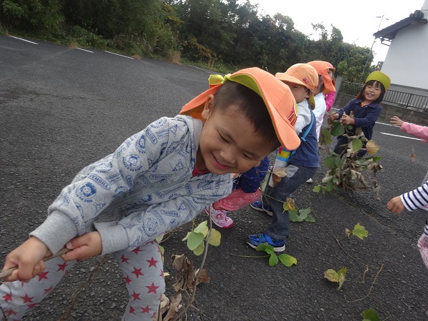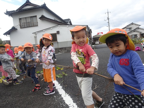 お散歩に出掛け、長いつるで綱引きごっこをしました。