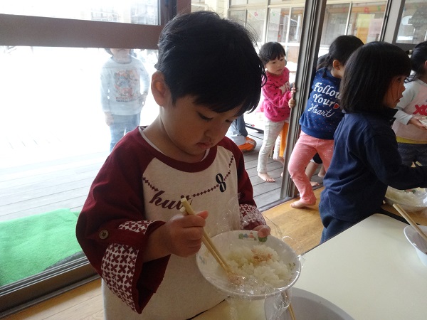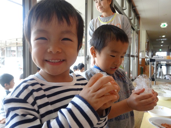 釜でご飯を炊くところから見ることができ、美味しいご飯が食べられることの喜びや感謝の気持ちをより感じることのできたばす組さんでした。