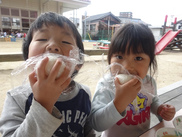 大きな釜で炊いて自分で握ったおにぎり、とってもおいしいね!