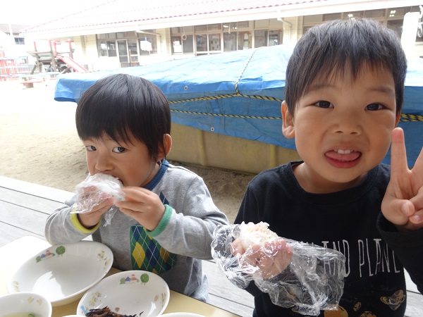 テラスでひこうき組さん・ろけっと組さんと一緒にいただきま~す☆