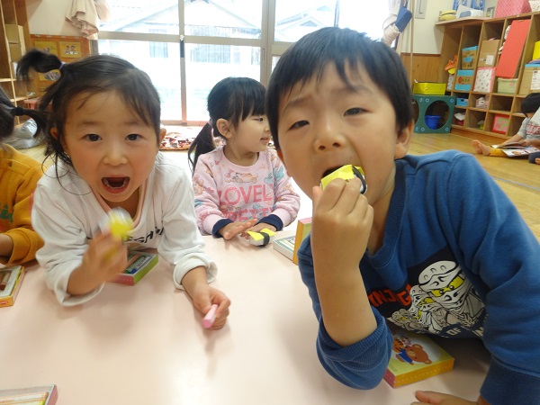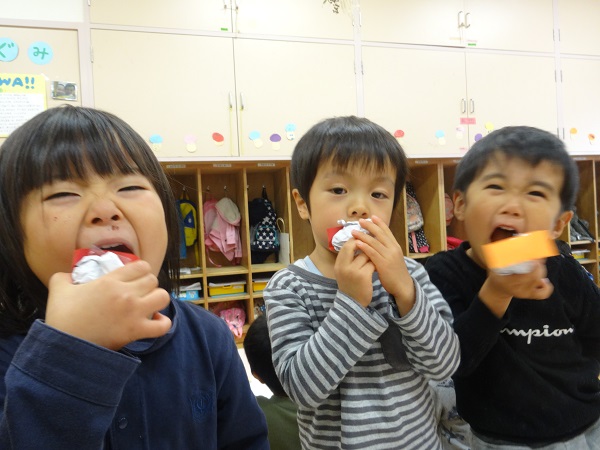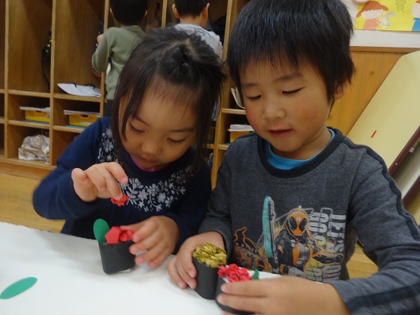 2018年11月30日 スシ食いねェ!今日のばす組さんはお寿司屋さんに変身!ぎゅぎゅっとシャリを握る手つきが本格的!ネタを作ります!「エビってこんな感じ?」こちらは軍艦巻き!いくらと納豆を乗せてみました♪「お待ちどうさま❤軍艦巻きできました!」美味しそうなお寿司に、思わずパクリ!!素敵なお寿司が勢ぞろい✨ばす組お寿司屋さん、ぜひ食べに来てくださいね☆
