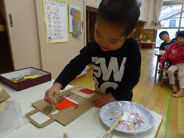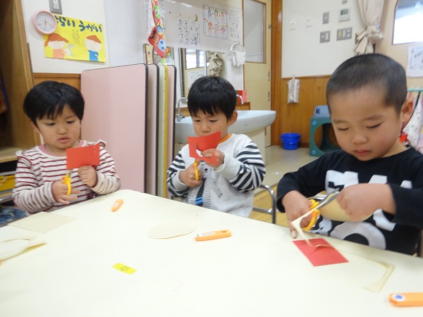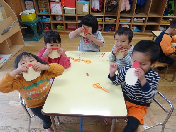 はさみで切った画用紙をお鼻にくっつけて