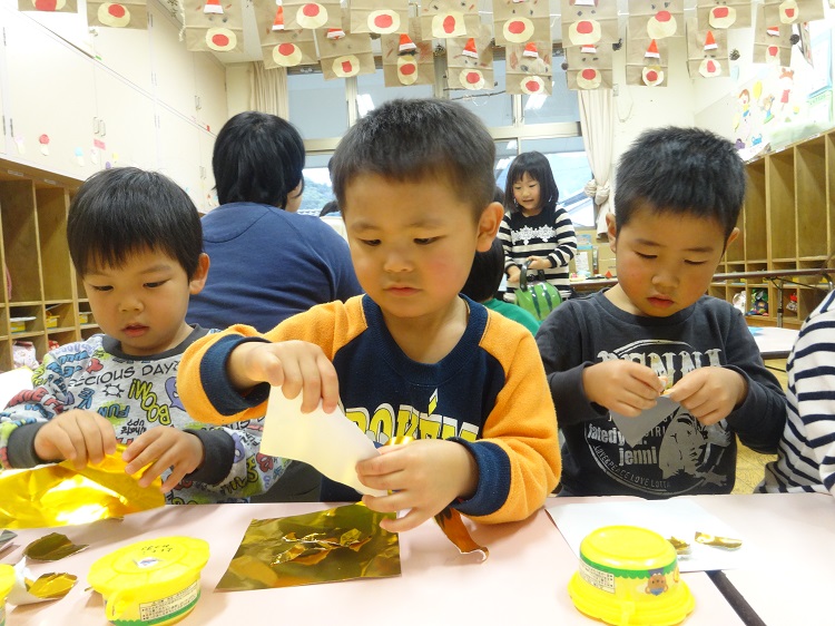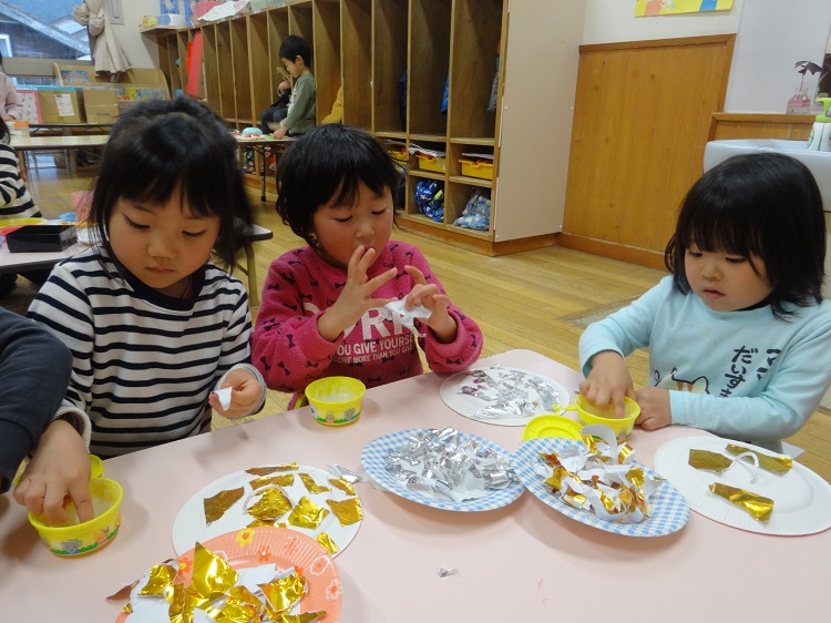 金か銀、好きな色を選び、細かくちぎってから本体に貼り付けていきました。