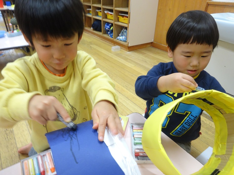 好きな色の太鼓を選んで、クレヨンで模様を描きましたよ。