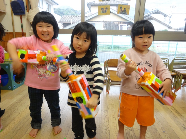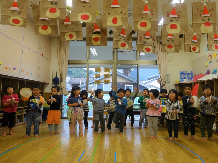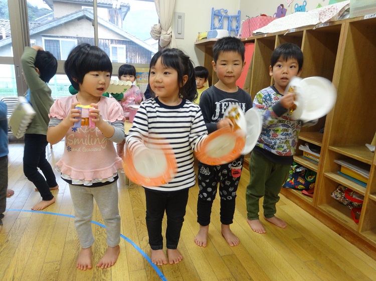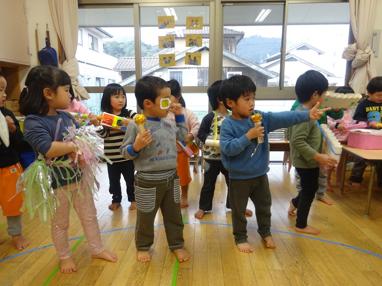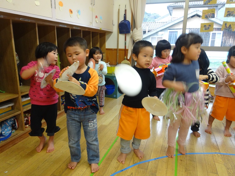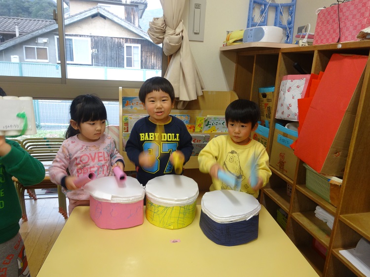 「太鼓チーム」はお隣のお友だちと息を合わせてリズムよく演奏していましたよ。