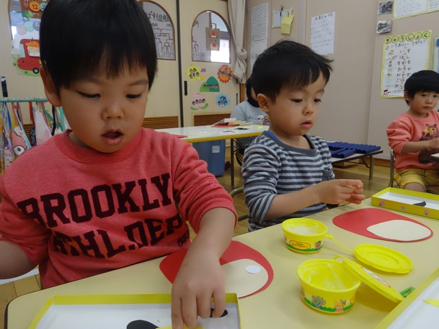 だるまさんの形の台紙にパーツをのりで貼ります。