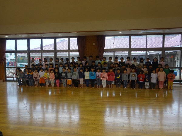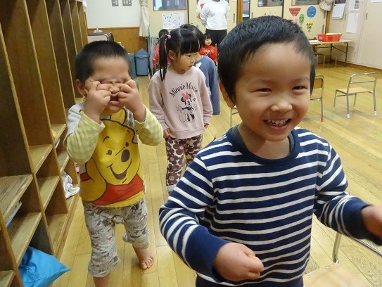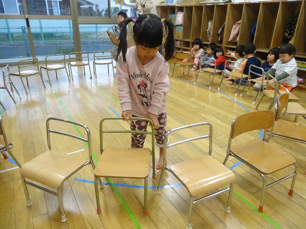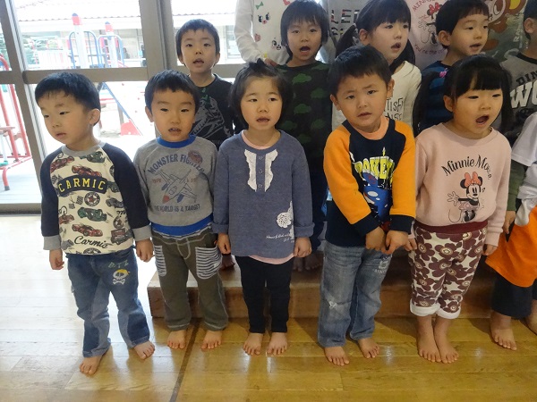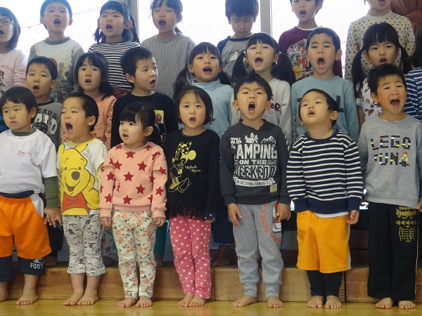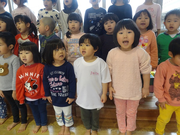 2019年01月15日 お楽しみ会に向けて!3クラス合同での練習が始まりました。お兄さんお姉さんに負けず、大きく口を開けて元気いっぱい歌っていますよ■お部屋に戻って、椅子取りゲームをしました。セッティングも子ども達がしています☆音楽が鳴ると、気持ちも盛り上がって大はしゃぎ!笑顔が素敵なばす組さんなのでした☆