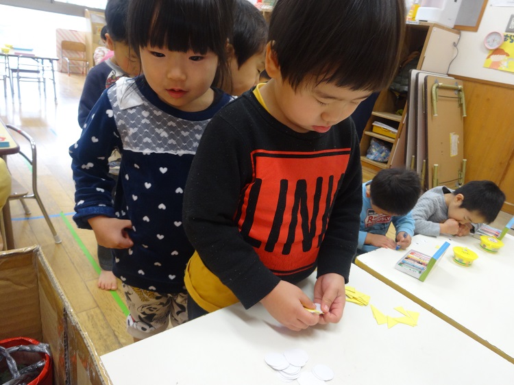 小さいものには少量の糊を付けて...と、使いたい糊の量を調節しながら貼っていく子もいました。