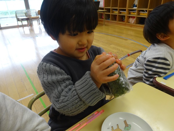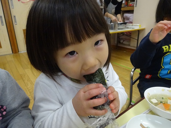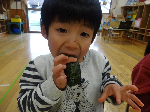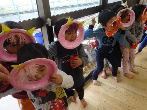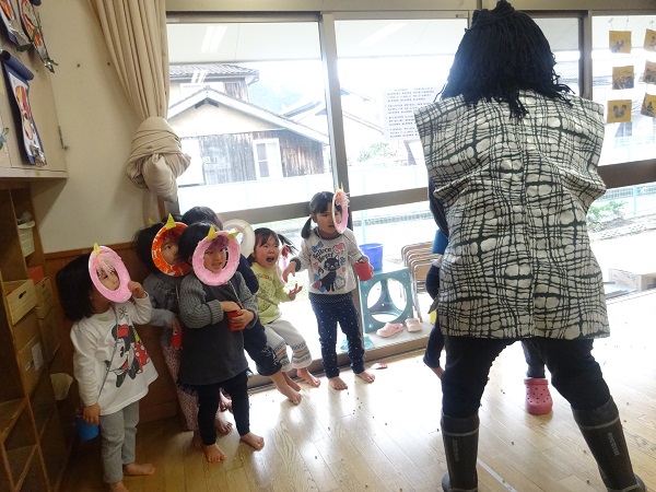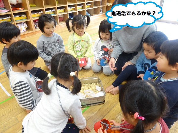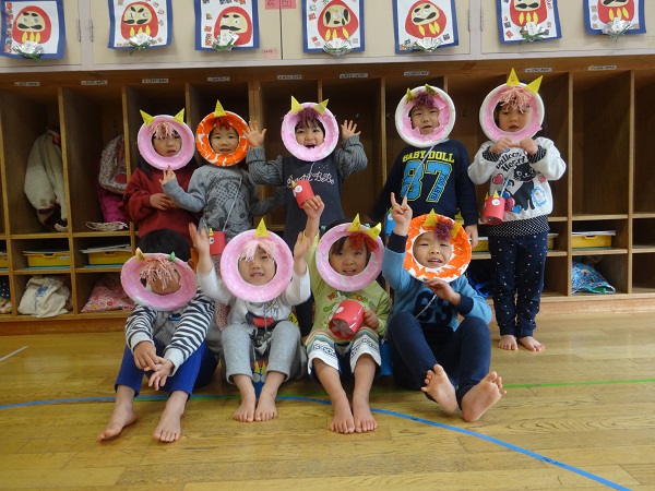 2019年02月01日 鬼は外!豆まきをしました!豆入れに豆を入れて、準備完了☆ついに鬼が登場■鬼の登場に涙が止まらないばす組さん■勇気を出して「鬼は外~!」と豆をまきます。無事に鬼を退治することができました。その後は節分の由来を聞いたり、どうして豆まきをするかのお話を聞いたりしたばす組さんです。給食の時には恵方巻をパクリ!今月も元気いっぱい過ごせるようにお祈りしながら食べたばす組さんです✨