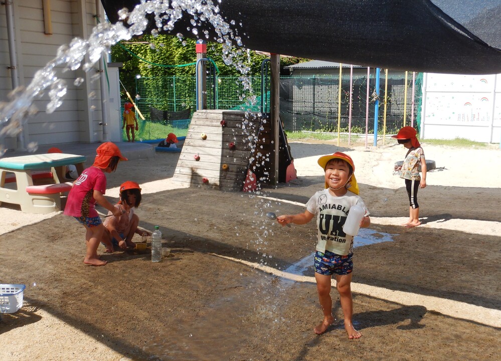 今日は…♪ 今週も元気にスタートしました!! 園庭に出ると、「お外は暑いねー!!」「早くお水で遊びたい♪」と、あまりの暑さに水を求める子どもたち! 水を触って、体にかけて…あっという間に暑さを忘れて遊びに夢中になり、笑顔でいっぱいになりましたよ♪ 水遊びやごちそう作り、お山作りを楽しんだばす組さんでした☆