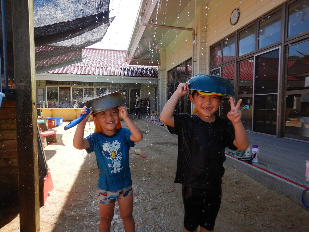元気いっぱい☆ 泥んこ遊びをしました。 アサガオで色水作りをしたり、ろけっと組さんから泡をおすそ分けしてもらって、体や帽子につけたりして楽しみましたよ☆ ホースシャワーで「あー!きもちいい!!!」と顔を上に向けて水を浴びたり、ろけっと組さんと一緒にフライパンを帽子にして一緒に遊んで笑顔いっぱいでした! 保育者や友だちに沢山水をかけてもらってとっても気持ちよさそうなばす組さんでした☆