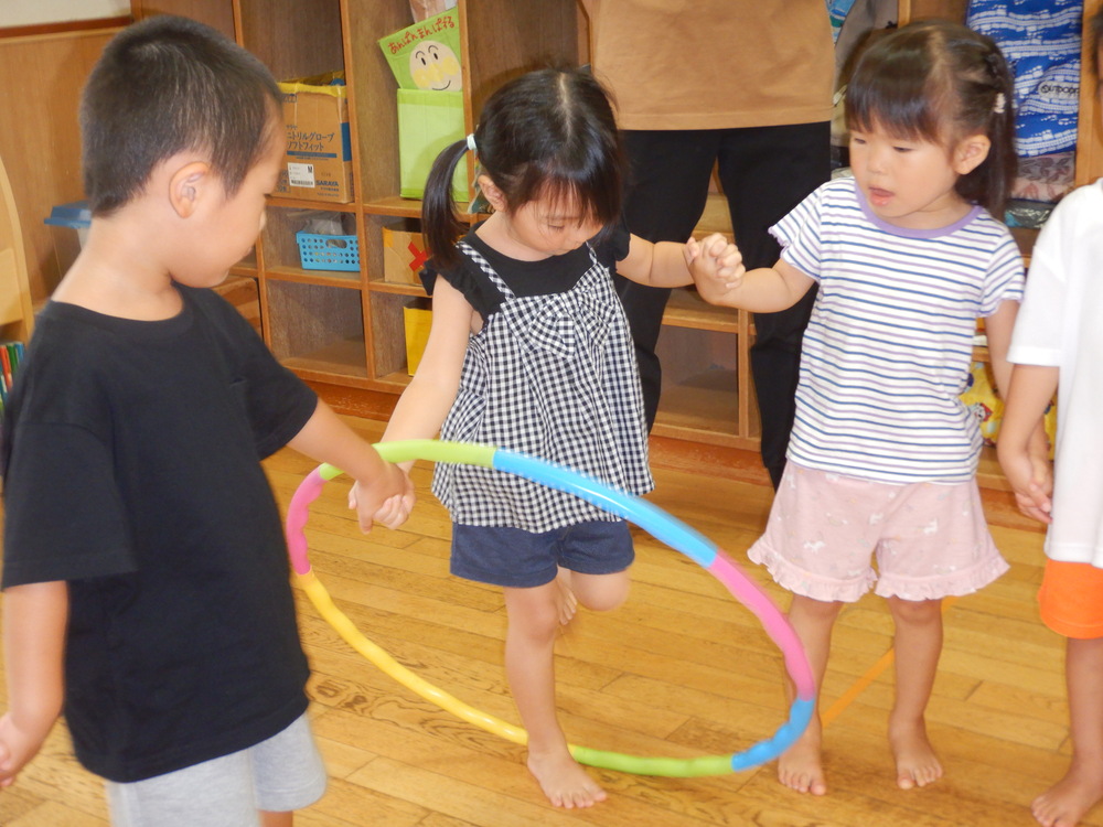 最初は、フラフープくぐりをしました。繋いでいる手を使わずに、体をクネクネと動かしたり足や頭からくぐってみたりなど、考えながらくぐることができましたよ。上手にくぐれるようになってきたところで、2チームに分かれて競争をしました。早くゴールしたチームは、「がんばーれ!」と相手のチームを応援する素敵な姿を見せてくれました☆