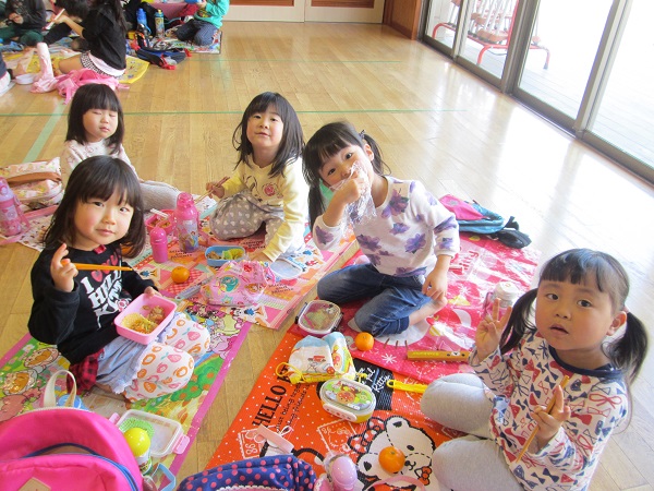 2018年01月12日 お弁当ごっこ♪今日は味付けのりをつけて、おにぎりを握りました■「うわ~■美味しそう~■」バイキング形式で子ども達がお弁当におかずを詰めましたよ♬自分の食べられる量も考えて上手に入れることが出来ました☺「からあげ大きいの入れちゃお■」遊戯室にシートを広げて「ピクニックみたい♬」と遠足気分です✨「美味しかった~!」!とあっという間に完食でした✨