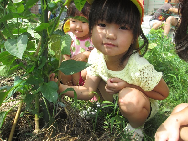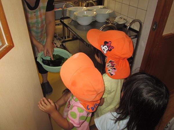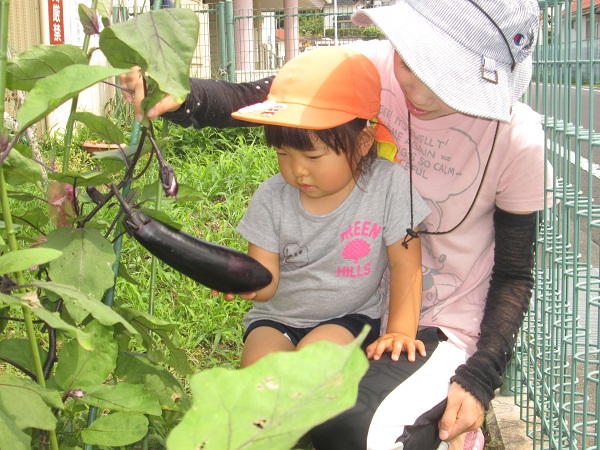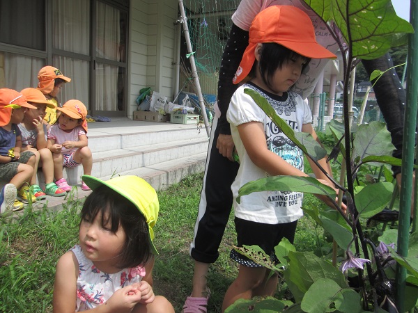 2017年07月07日 野菜を収穫しました♪ばす組で育てている茄子が大きくなりました■「わあ~!大きい!」と興味津々です。ろけっと組さんのピーマンも大きくなったので収穫させてもらいました■給食先生のところに収穫した野菜を持って行きましたよ!