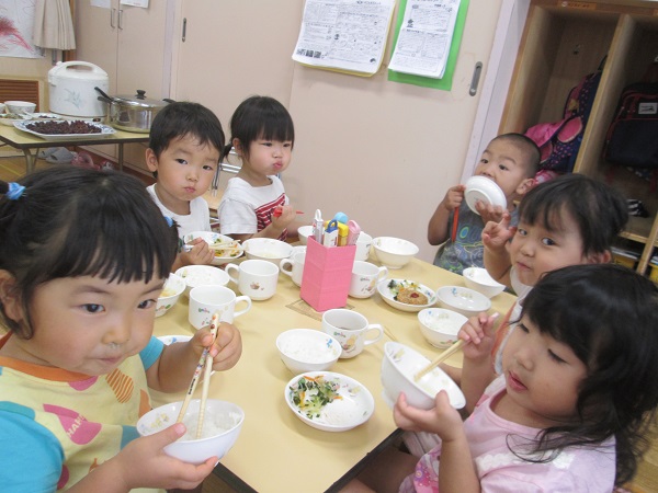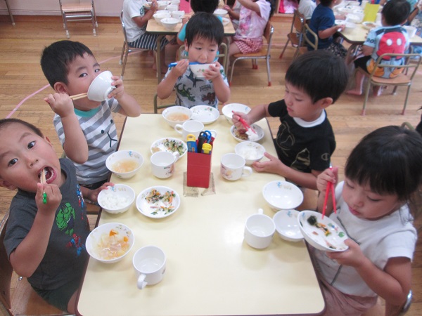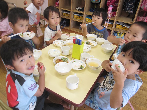 たくさん遊んだ後は、大好きな給食の時間です。