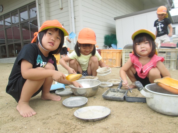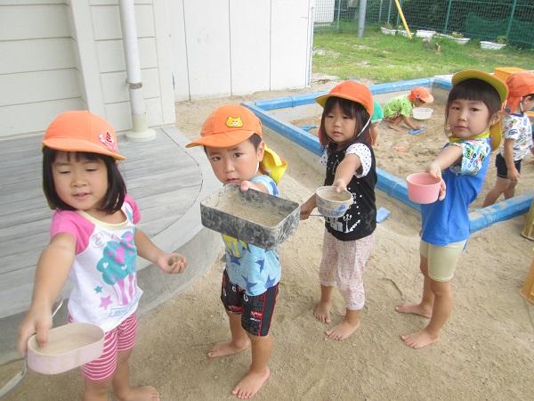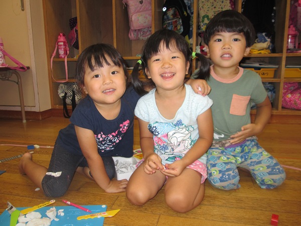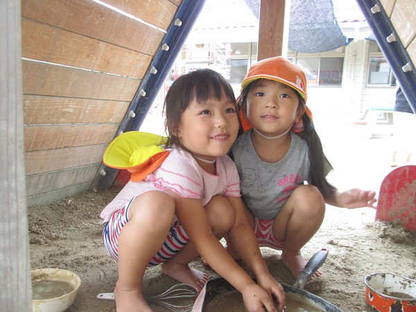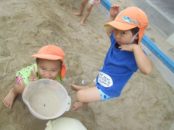 2017年07月24日 仲良しこよし♪今朝は雨がポツポツ...☂楽しみにしていたプールはお休みでしたが、次第に雨が上がったのでみんなで泥んこ遊びスタート♬何ができるかな...?「じゃーん!みてみて♪」「ダンゴムシも見つけたよ!」仲良しこよしで「ハイポーズ♬」お部屋で遊んだお友達は、粘土でごちそう作り。盛り上がっていましたよ。