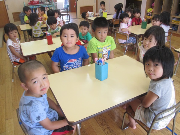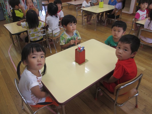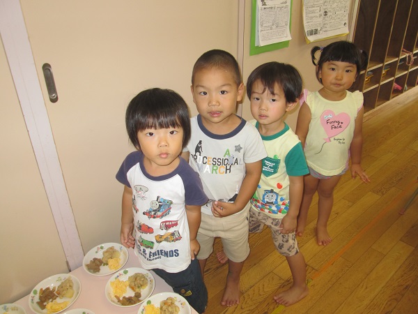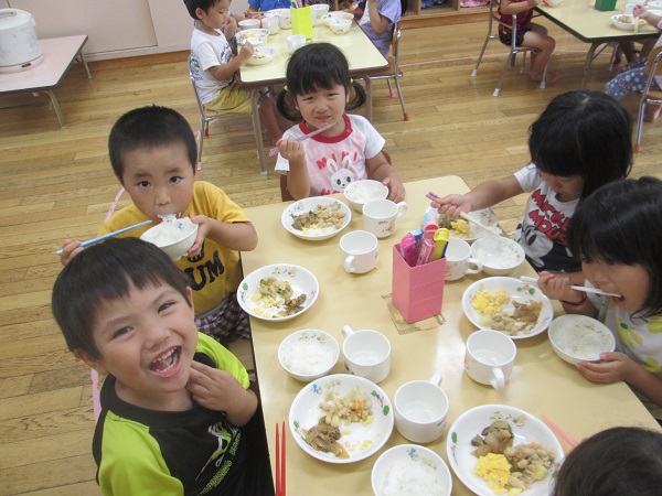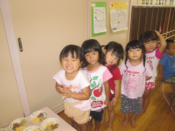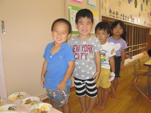 2017年07月28日 給食の準備の時間は...給食の準備の時間は、静かに背中をピンと伸ばして座って待ちます。並ぶのもとっても上手になりました!お皿を運び終わったら、みんなで「いただきます」待ちに待ったおいしい給食の時間です♪美味しいね♪