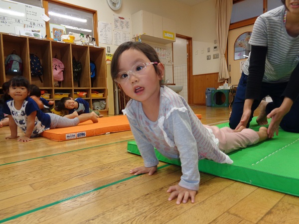 ろけっと組さんから、アザラシのようにして歩くと、腕の力がついて跳び箱や鉄棒もできるようになると聞き、ばす組さんもチャレンジ!!