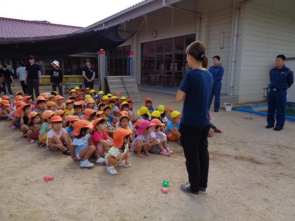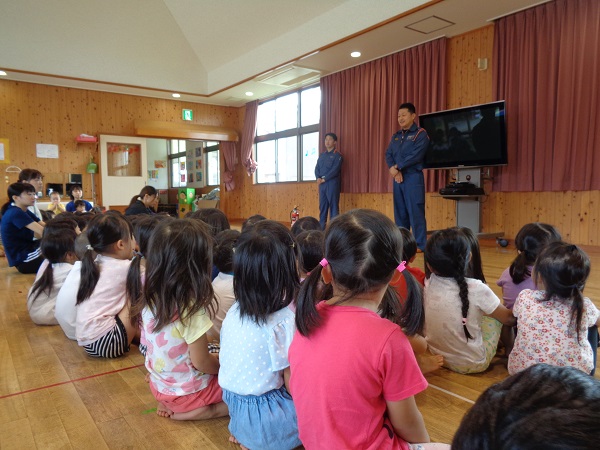 今月は大田消防署から消防士さんが2名来られ、火事になった時の逃げ方や『お・は・し・も』の大切なお話をしてくれました。