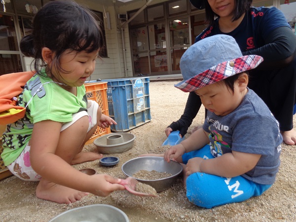 給食のあいさつをしたり、テーブル拭きをしたり、ゴザ運びをしたり...