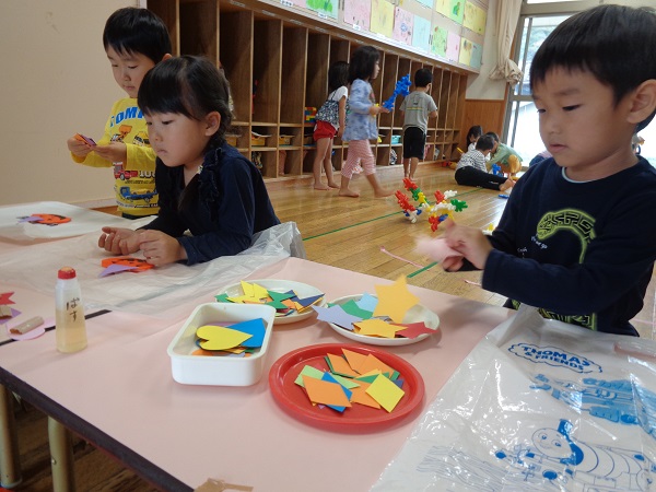 その服に、先週自分たちで作ったがぼちゃの折り紙や可愛い飾りを付けましたよ✨