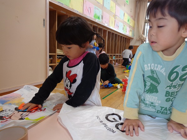 家庭で用意してもらった袋を服にして、サイズが合うかどうか試着♡