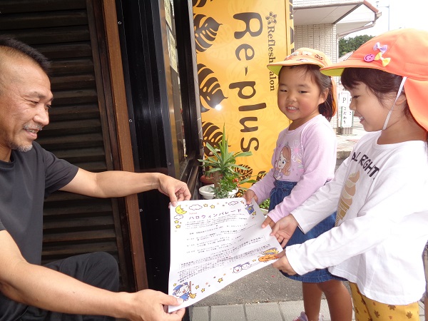 ハロウィンパレードで通るお店にポスターを持っていきました。