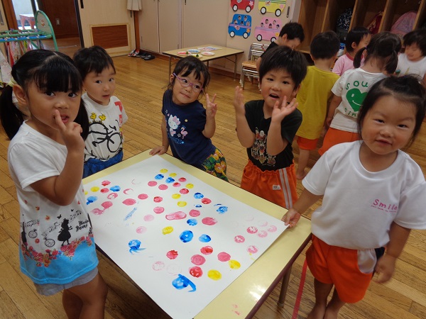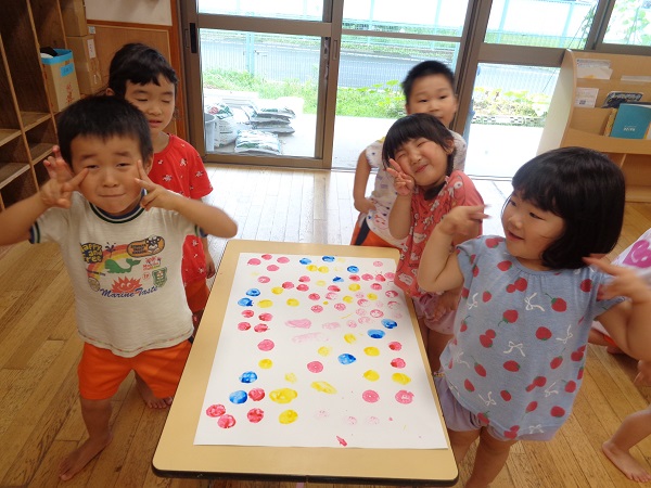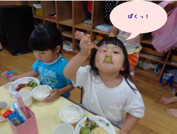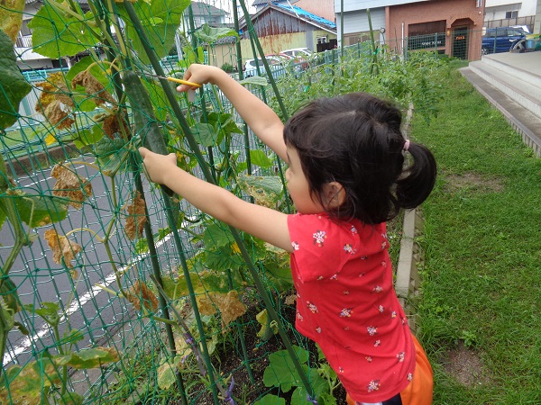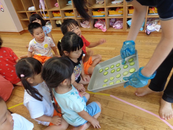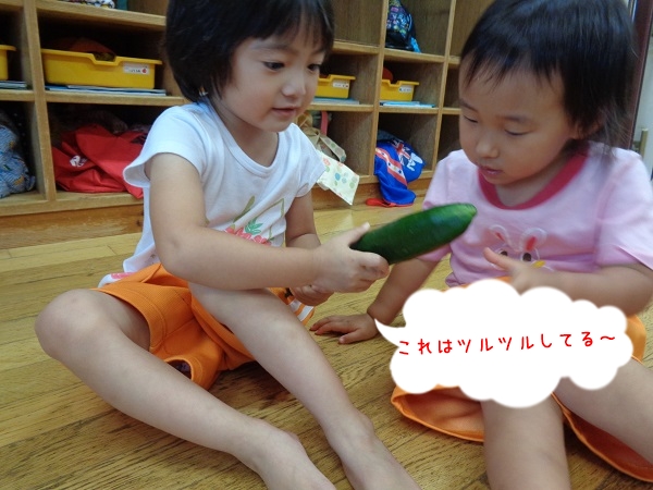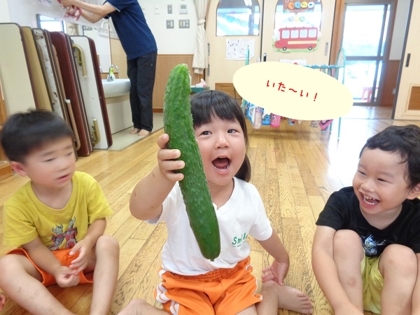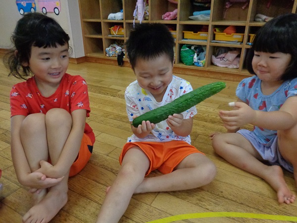 2020年07月10日 きゅうり!畑でできたきゅうりを収穫しました!2種類のきゅうりの違いを観察しましたよ。触ってみて違いに気付いたばす組さん。次は包丁で切ってみて断面の違いを見ました。ヘタで野菜スタンプ!まん丸やおにぎりみたいな形、ギザギザの形など楽しみましたよ。出来上がり~!またお部屋の前に飾るので見て下さいね。収穫したきゅうりはナムルにしてもらって給食で頂きました。美味しかったね♪