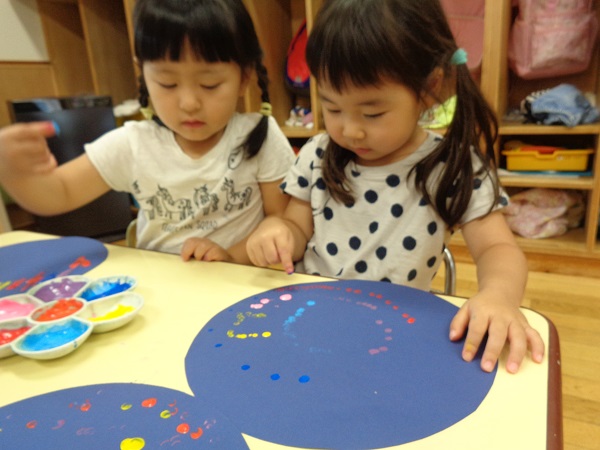 自分の好きな色の絵の具を指につけて思い思いに描きます✨