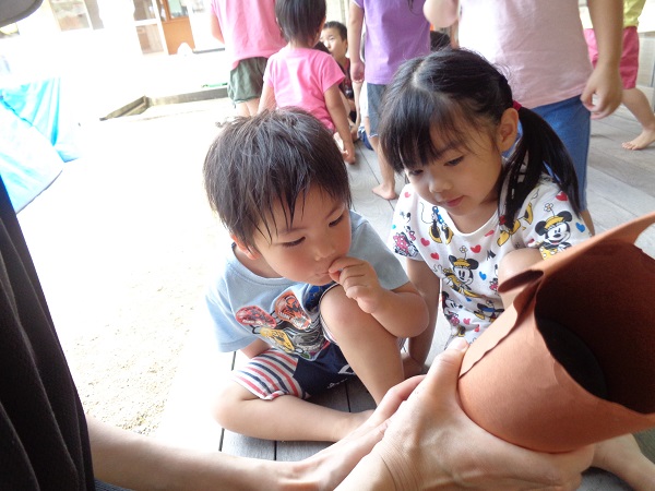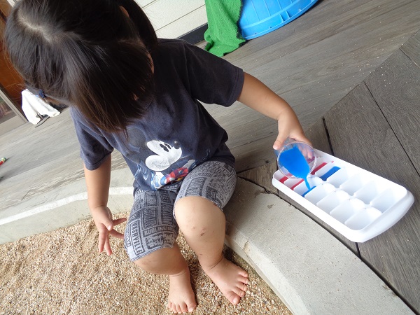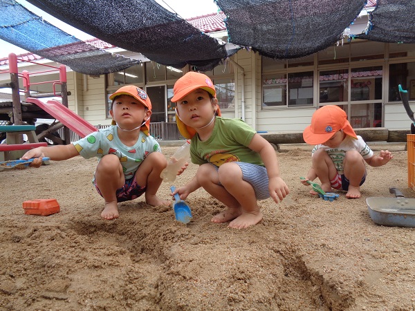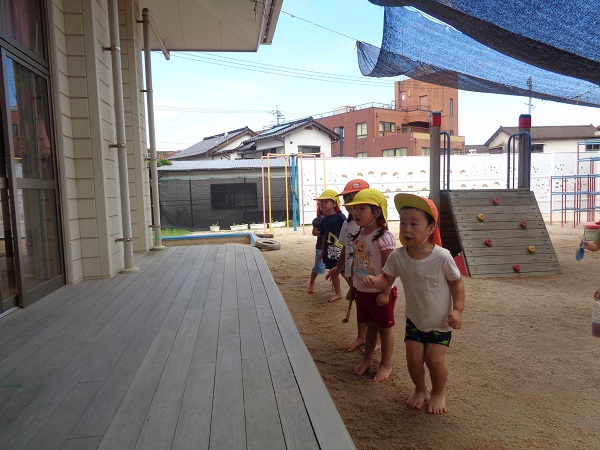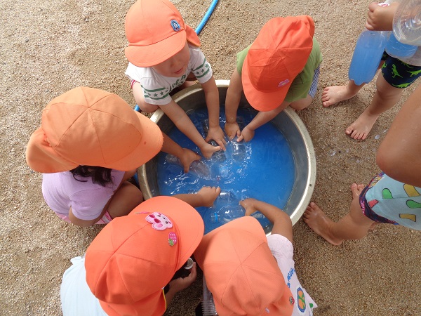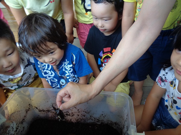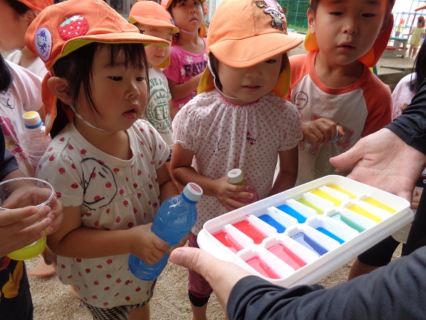 2020年07月08日 やったー!雨が上がり、泥んこ遊びをすることを伝えると「やったぁー」と子どもたち。色水遊びは人気です。製氷皿に色水を移して...冷凍庫に入れます。どうなるかはまたのお楽しみ♪他にも砂場で遊んだり、ろけっと組さんのキラメイジャーの踊りをみたり楽しみました。そして、保育園に仲間入りしたカブトムシのサナギが成虫になり、みんな興味津々。ばす組のせなくんの様子も見ました。せなくんもそろそろ成虫になりそうです。楽しみだね☺