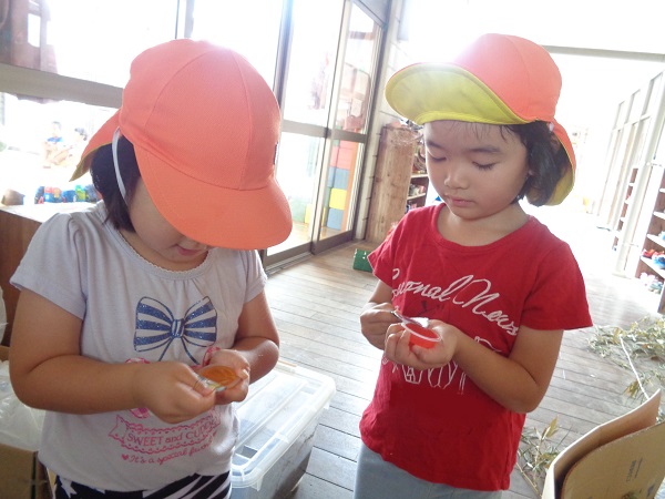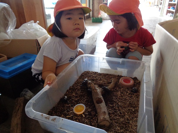 昨日、カブトムシが無事に成虫になり、今日からエサやり当番が始まりました!