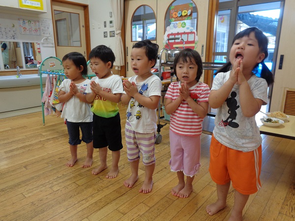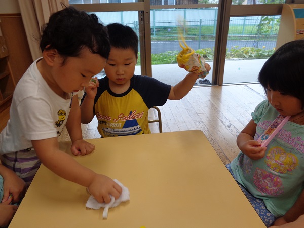 給食の前のテーブル拭きやご挨拶もお当番のお仕事です。