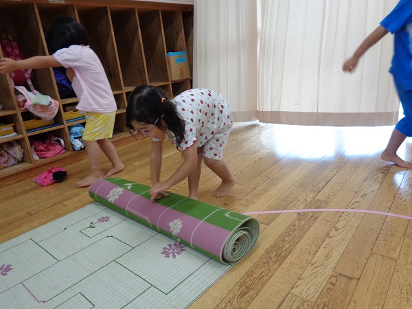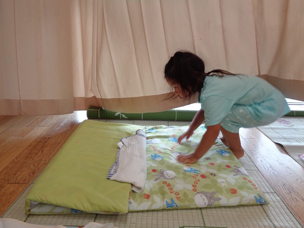 そして、お昼寝前のござ敷きに布団敷きもします。