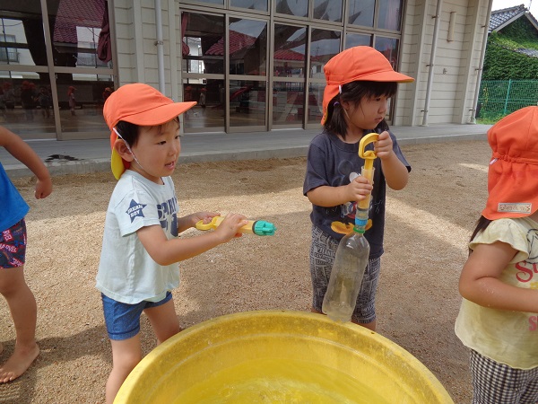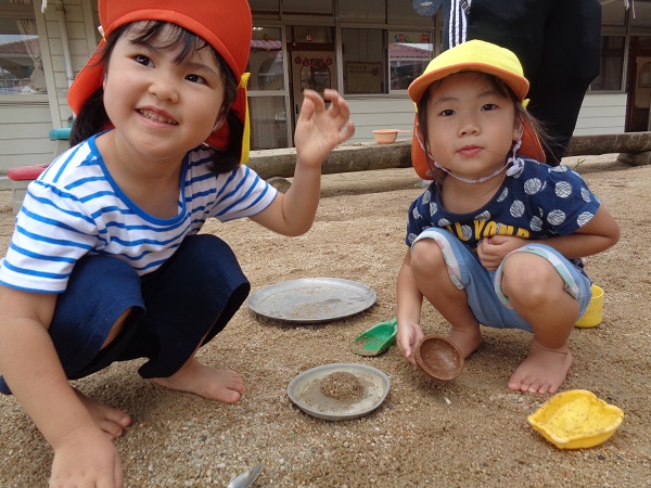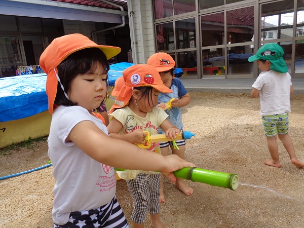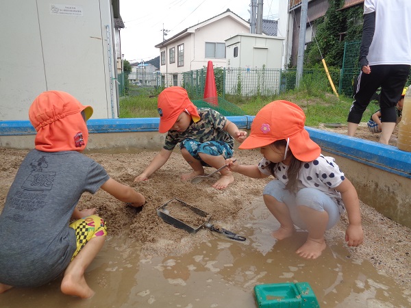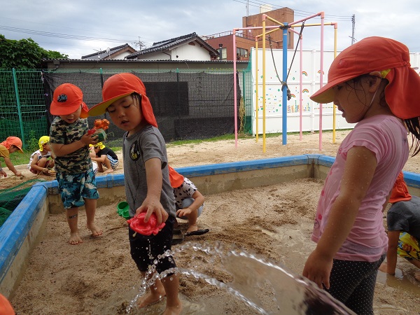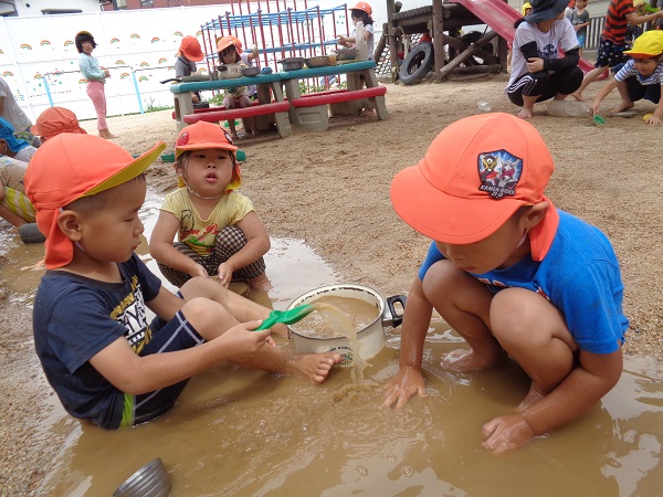 2020年07月27日 久しぶりに・・・久しぶりにみんなで泥んこ遊びをしました♪水鉄砲は人気です!砂場に水を出すと、涼を求めて近づいて来ます。水たまりに座り込んで遊ぶお友だちも。こちらはチョコケーキを作ってます。ひこうき組さんと一緒に遊ぶ姿も見られましたよ。お昼寝はぐっすりのばす組さんでしたzzz