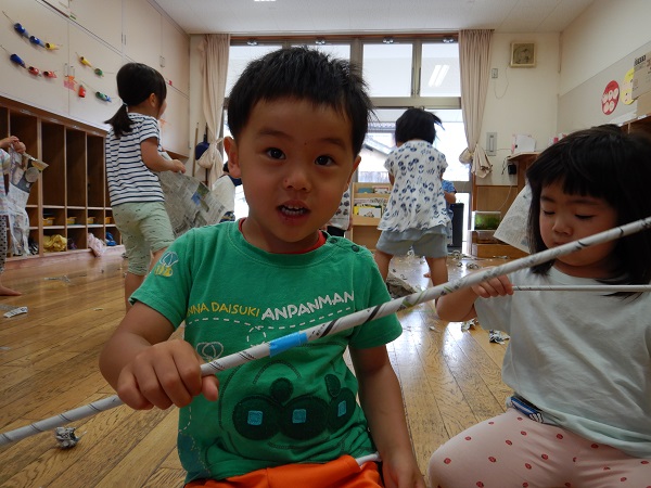 保育者に剣の作り方を教えてもらい、上手にクルクル巻いていきます■
