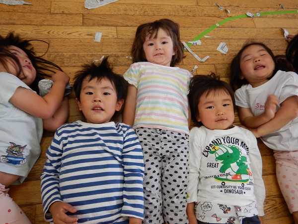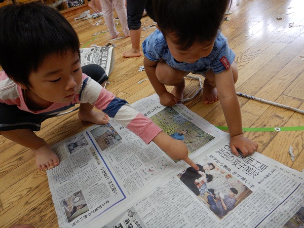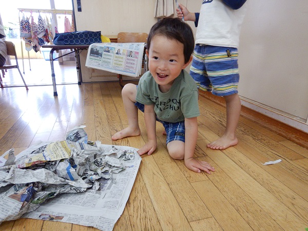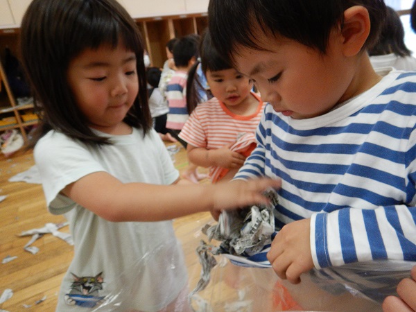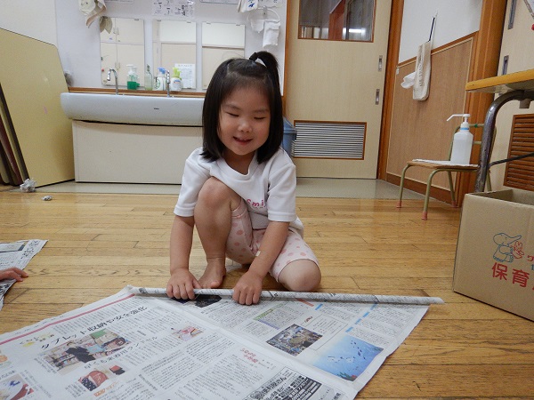 ごみ収集車になりきって新聞紙を集めて遊ぶお友だちもいました!