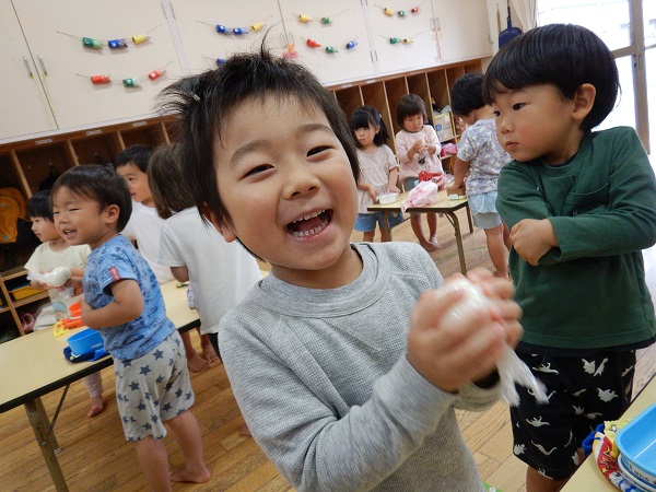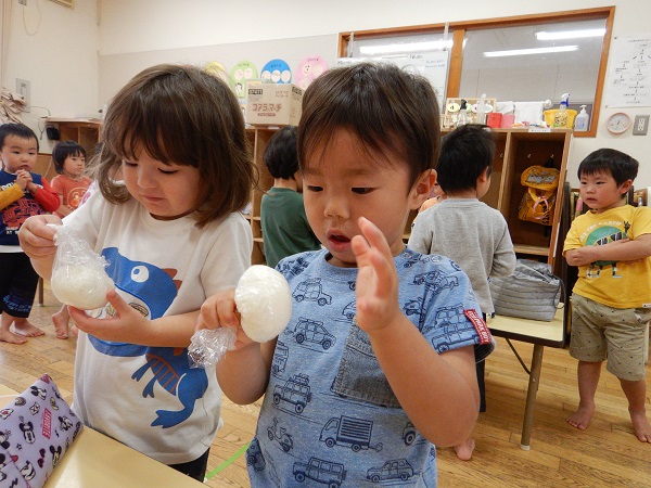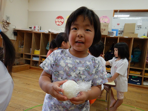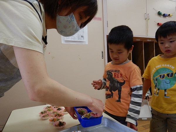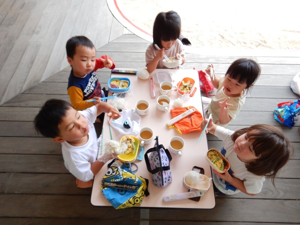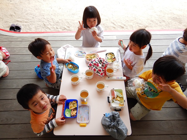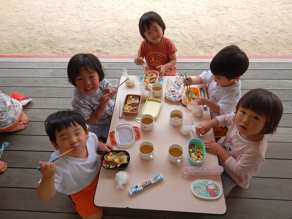 2022年05月20日 ランチタイム♪今日は楽しみにしていたお弁当ごっこの日♪みんなでおにぎりをにぎりました■おにぎりぎゅっぎゅっぎゅ♪たのしいな!!保育者と一緒におかずをつめて完成!!出来上がったお弁当をテラスで食べましたよ✨みんなで食べると美味しさもより一層☆おいしくて楽しいランチタイムとなりました。お弁当箱の準備、ありがとうございました。
