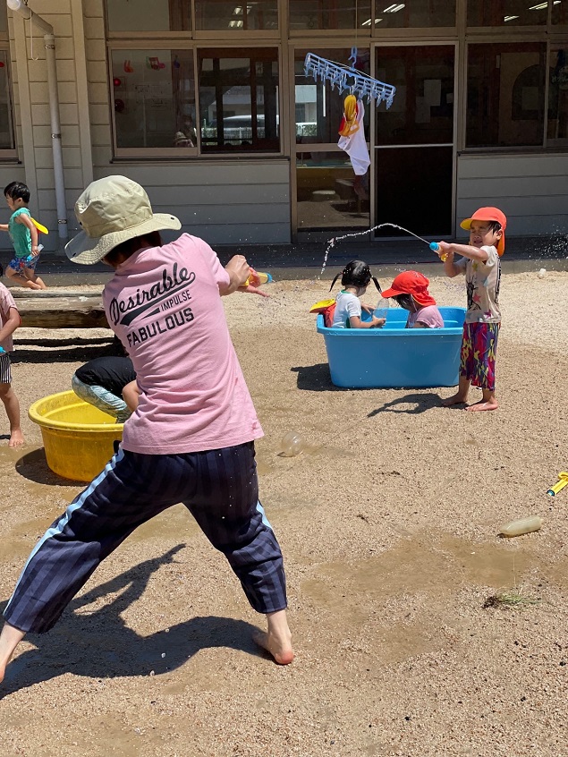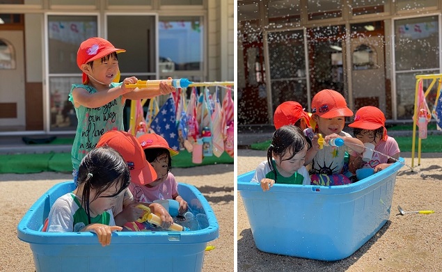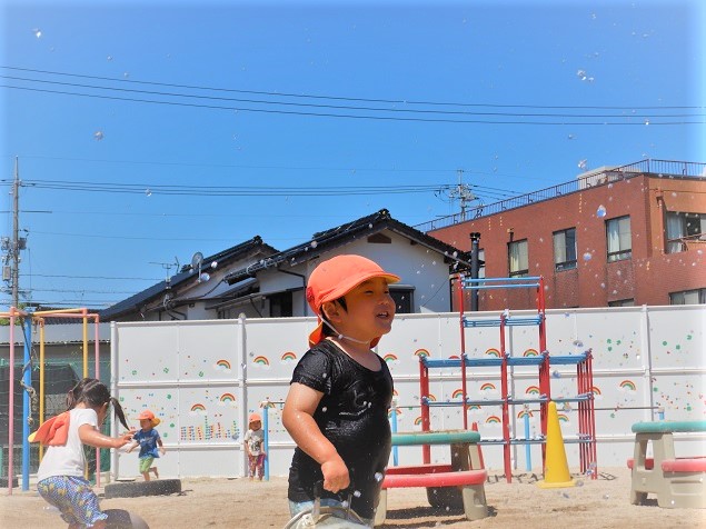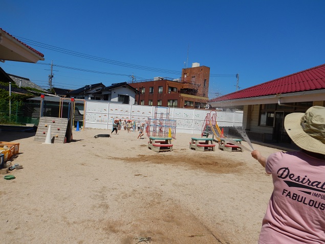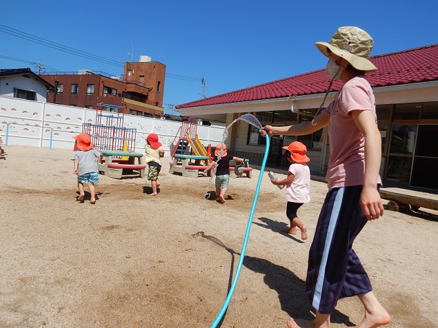 保育者がホースから水を出すと・・・