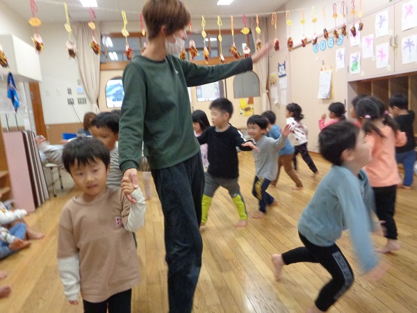 『自分のイメージした動きを自由に表現し楽しむ』事をねらいに、保育者も一緒になって変身遊びを楽しみましたよ☺