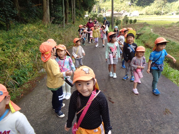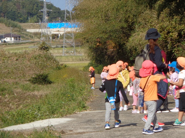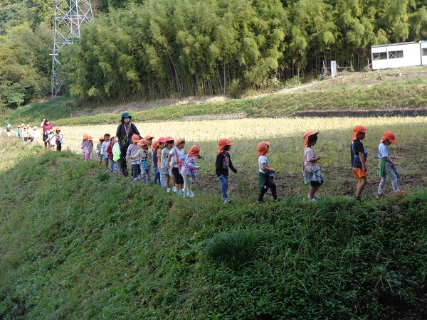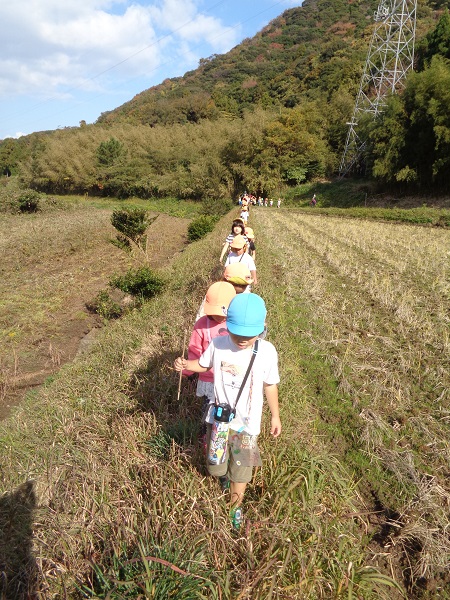 狭―いあぜ道も「探検だ~!!」と一列に並んで歩いてみました■