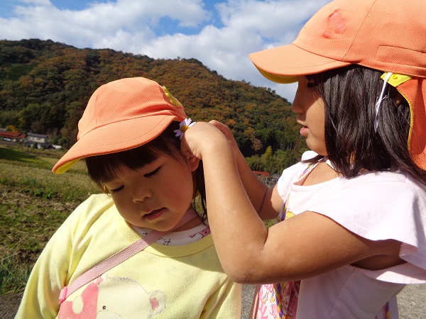 「お花をつけてあげるね」と、髪にお花を飾ってもらってうれしそう■