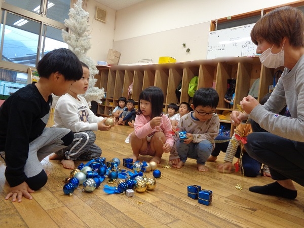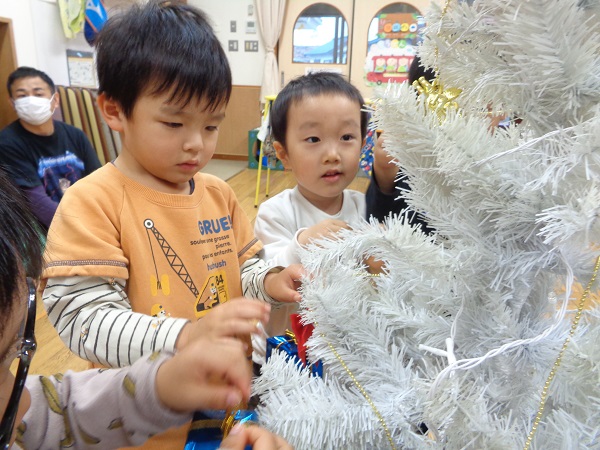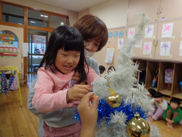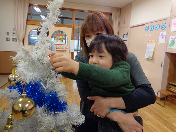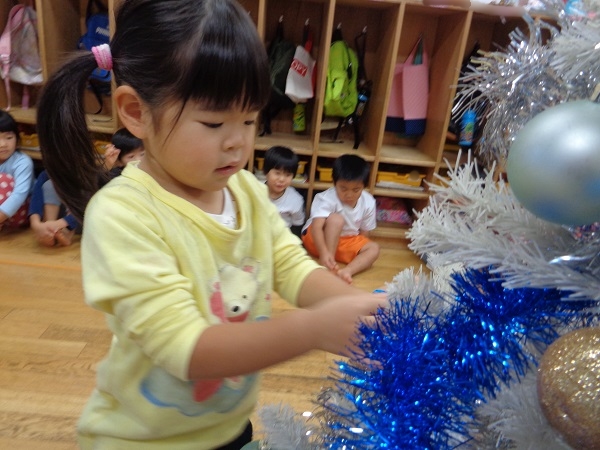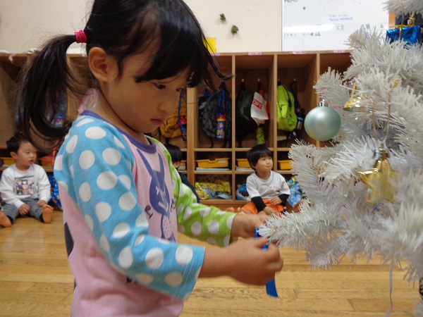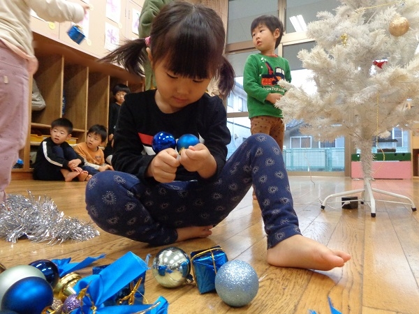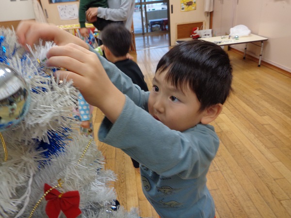 保育者が声をかけると、ぐるっとツリー全体を見まわして、少ない場所を選んで飾りつけをしていましたよ☺