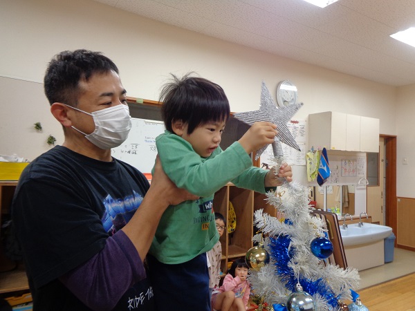 てっぺんのスターは、一日保育士体験に参加していただいたお父さんと一緒に飾ってもらいました✨
