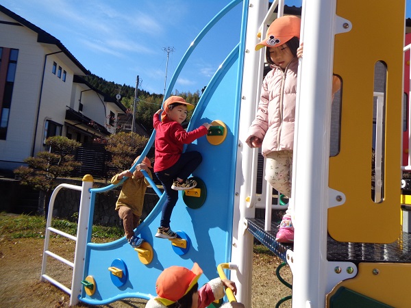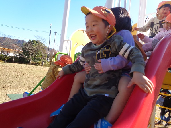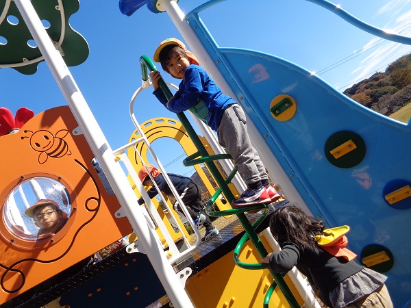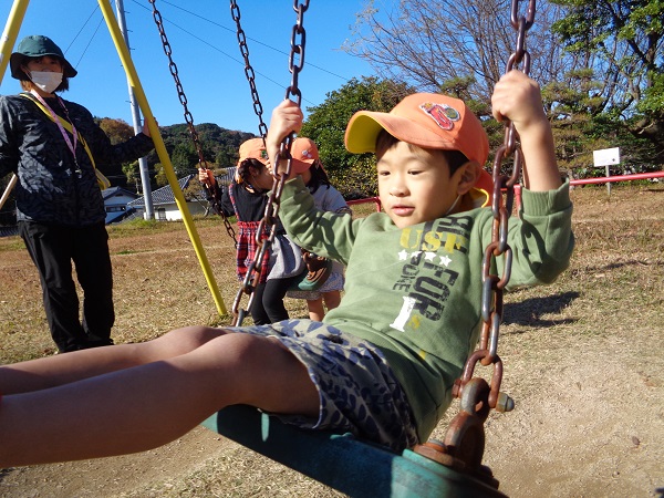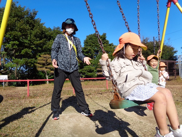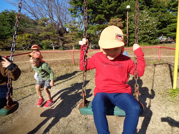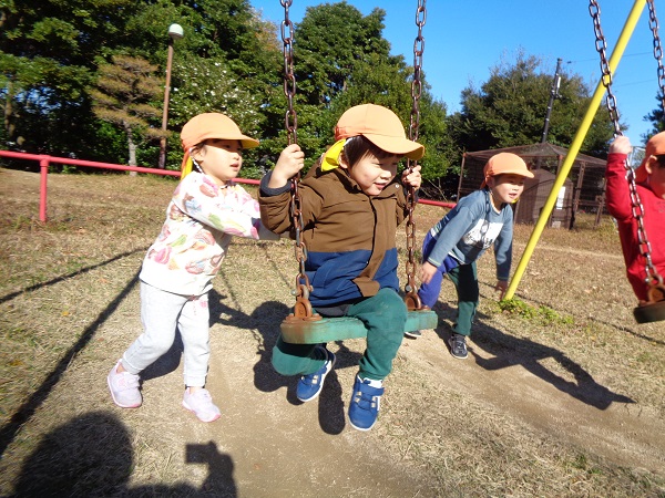 ブランコでは「押してあげるね」とお友だちと押し合いっこ■