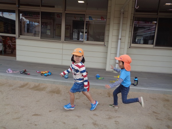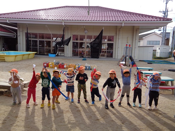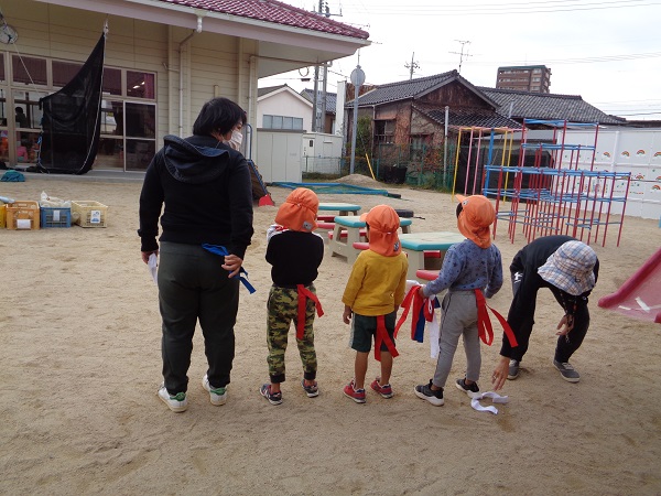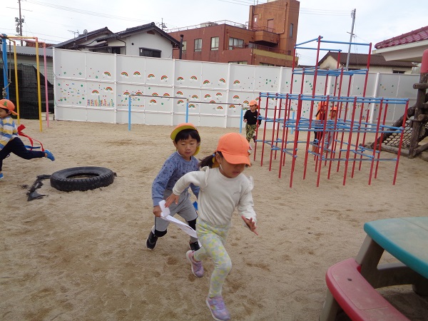 「楽しかった!」「またやりたい!」というお友だちがたくさんいたので、今日は園庭で「しっぽ取り」をしましたよ☺